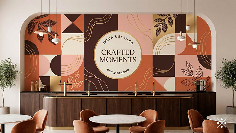 店舗のロゴやブランドメッセージ、独自のパターンを壁面全体に展開。空間全体のトーンを統一することで、ブランドの世界観を顧客へ強く印象付けることが可能です。