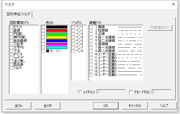 「要素種類/色/ペン/線種」など、図形が持つ属性を条件に、目的の図形を選択する図形特性フィルタ。複雑な図面の中から、必要な図形だけを簡単に選択することができます。