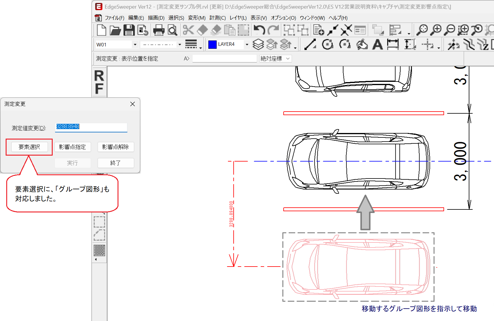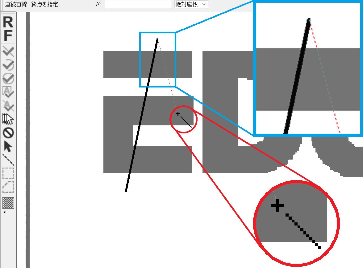 長期保存によって発生する図面の歪みや縮みを補正します。図面の中から、移動点と移動先点を指示すると、輪ゴムを引き伸ばすような感覚で図面全体の歪みを補正します。距離や尺度を意識しながら製図ができる、二次元CADを彷彿させる充実の作図機能