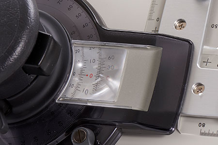 最小角度読み取り単位5分、角度を正確に読み取りできるバーニアヘッド。読み取り部分には1.5倍の拡大率を誇るフレネルレンズを搭載し細かい目盛も見やすい設計。アルミ彫刻による高精度一体仕上げの目盛盤には、建築土木図面で使用する勾配目盛(TAN目盛)※も備えています。もちろん2次基準線は、簡単なレバー操作で10分単位の設定が可能。MUTOHならではの伝統と信頼の技術で完成した高精度なバーニアヘッドです。