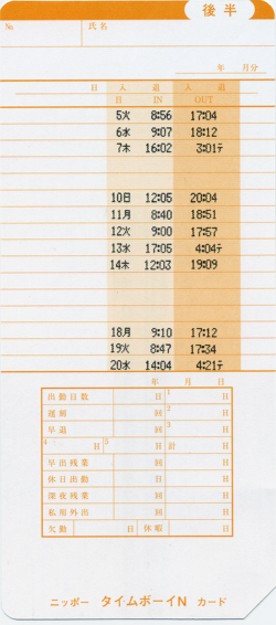 • タイムボーイNカード使用時 入1・退1・入2・退2の4欄印字