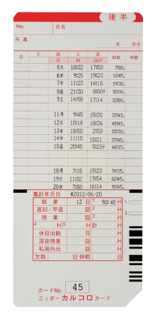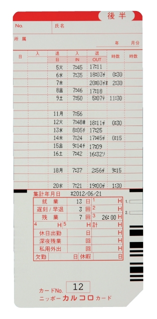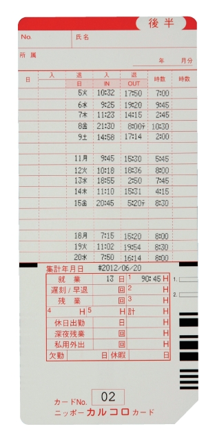 2欄印字:タイムボーイNカード(2欄設定時) カルコロカード