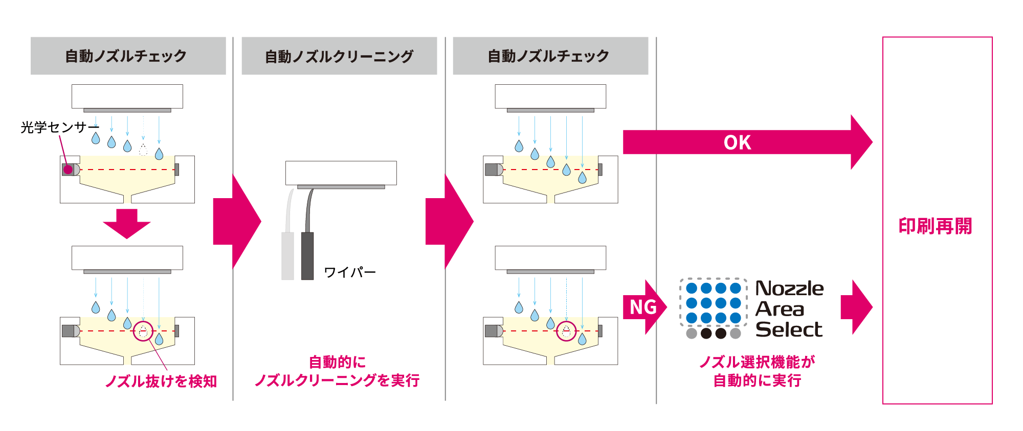 ノズル抜け時に正常に吐出するブロックのみを選択して印刷し、ダウンタイムなしで継続印刷が可能。印刷効率は落ちますが、仕事を止めない安心の機能です。