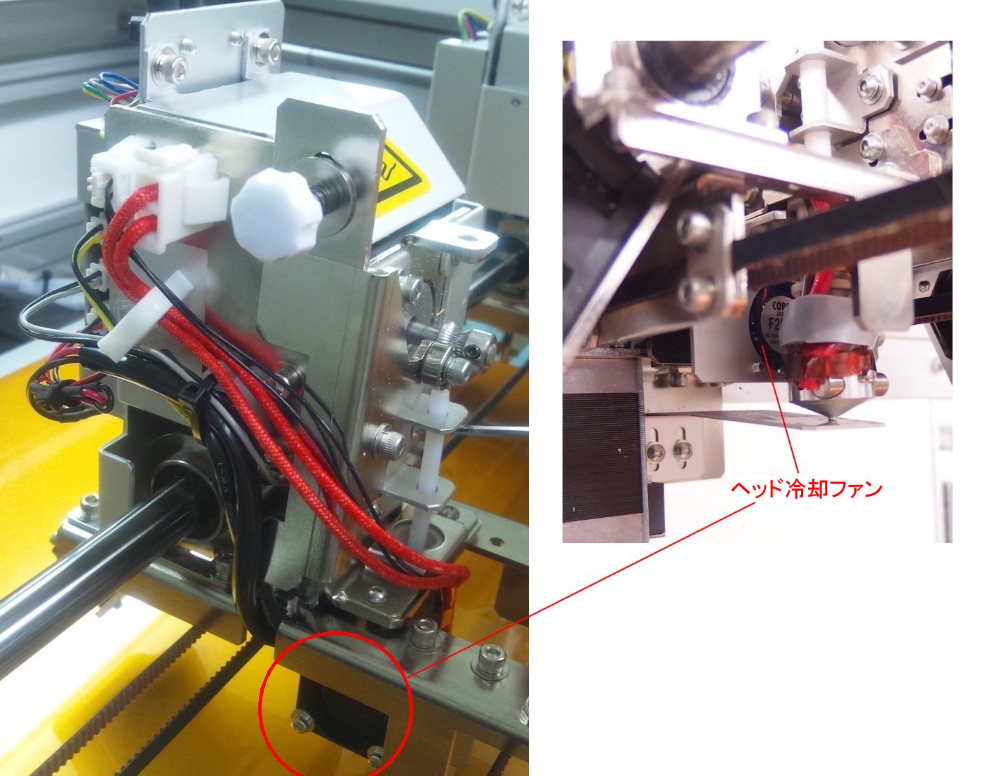 ヘッド交換の際、ヘッドのすぐ横に小さいファンがありますが、そこにフィラメントなどが引っかかっていないかどうか、 確認してください。このファンが動いていないと、ヘッド故障の原因になることがあります。(※このファンは電源が入っていると、常に動いています)