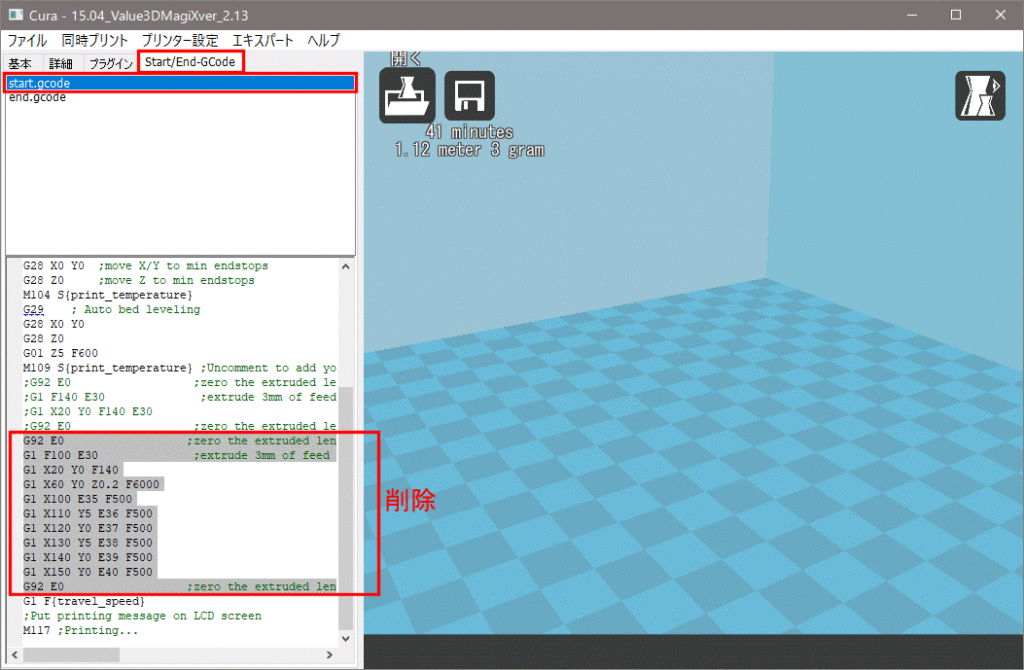 「Start/End-GCode」タブを選びます。さらに「start.gcode」を選びます。下にその内容が表示されますので、G92 E0~G92 E0部分を削除します。