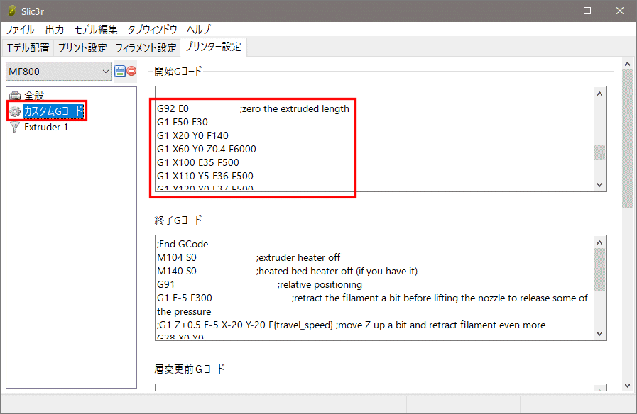 Slic3rの場合は、「プリンター設定」タブ「カスタムGコード」カテゴリに「開始Gコード」の項目があります。この中の、G92 E0~G92 E0の行を削除します。