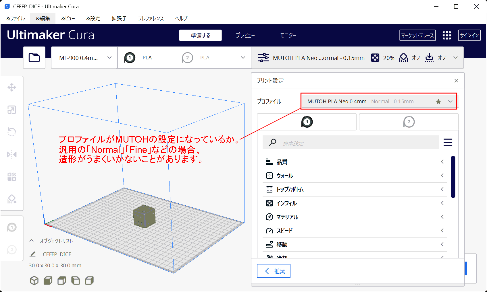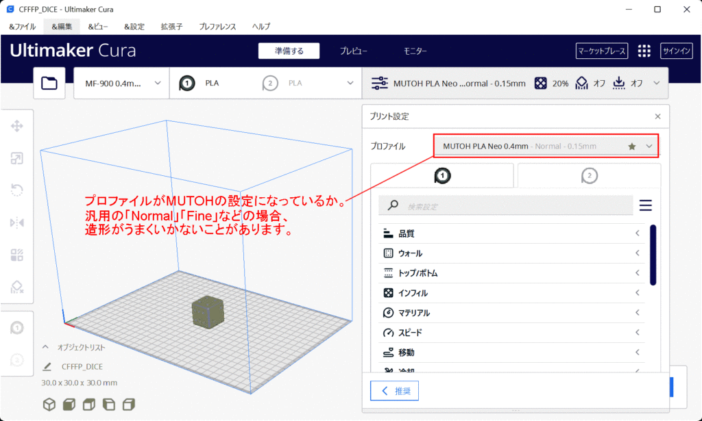 また、設定をCuraに読み込む方法は、以下「ソフトウエアインストールガイド」のP36「Cura にマテリアル(材料)を追加」~ を参照してください。