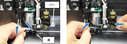 1. オートカットユニットのローラーをプラテンの溝に入れ、バーを軽く押しながらキャリッ ジに取り付けます。