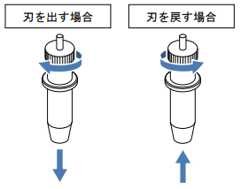 カッターホルダー先端から出す刃先の長さを調整します。 ホルダー上部のダイヤルを時計方向に回すと刃が出ます。反時計方向に回すと引っ込みま す。